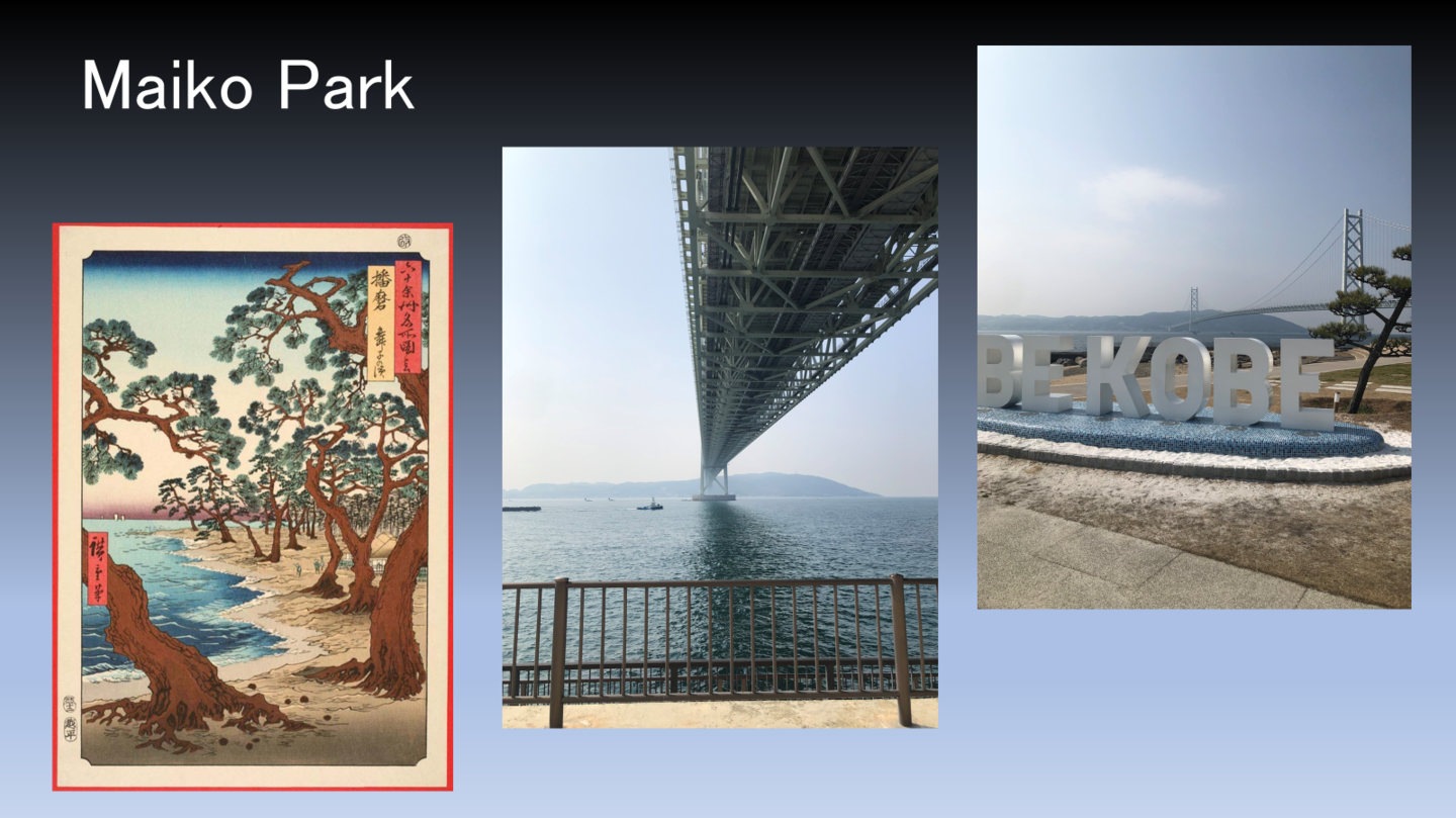 The area surrounding today’s Maiko Park, historically known as Maiko Beach, has long captivated visitors with its breathtaking scenery. Renowned for its pristine white sands, lush green pines, and a stunning view of the world’s second-longest suspension bridge, it has been cherished by Western residents and locals alike. During the Edo period, the internationally celebrated ukiyo-e artist Hiroshige Utagawa (1797–1858), famed for his masterpiece series “The Fifty-Three Stations of the Tokaido,” immortalized the enchanting beauty of Maiko Beach in his work “Harima Maiko no Hama.” His portrayal highlights the timeless allure of this coastal gem.